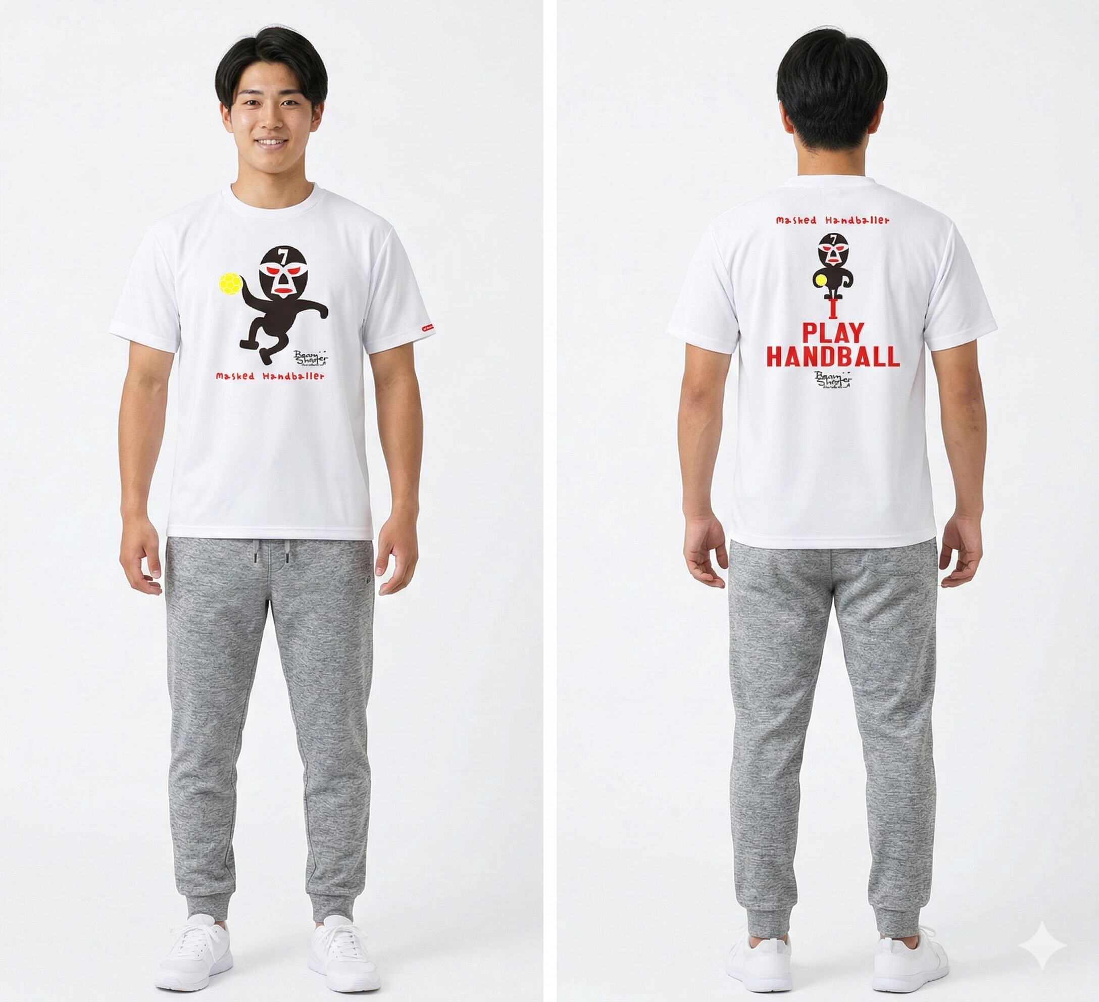 ビームシューター一番人気のTシャツ「マスクドハンドボーラー」 口数少ないこの謎の男は、プレーで物を語り、背中でチームを牽引する。 モデルの着用イメージは画像生成AIで作成したものであり、実際のプリントの大きさや細かなデザインは写真と異なる場合があります。